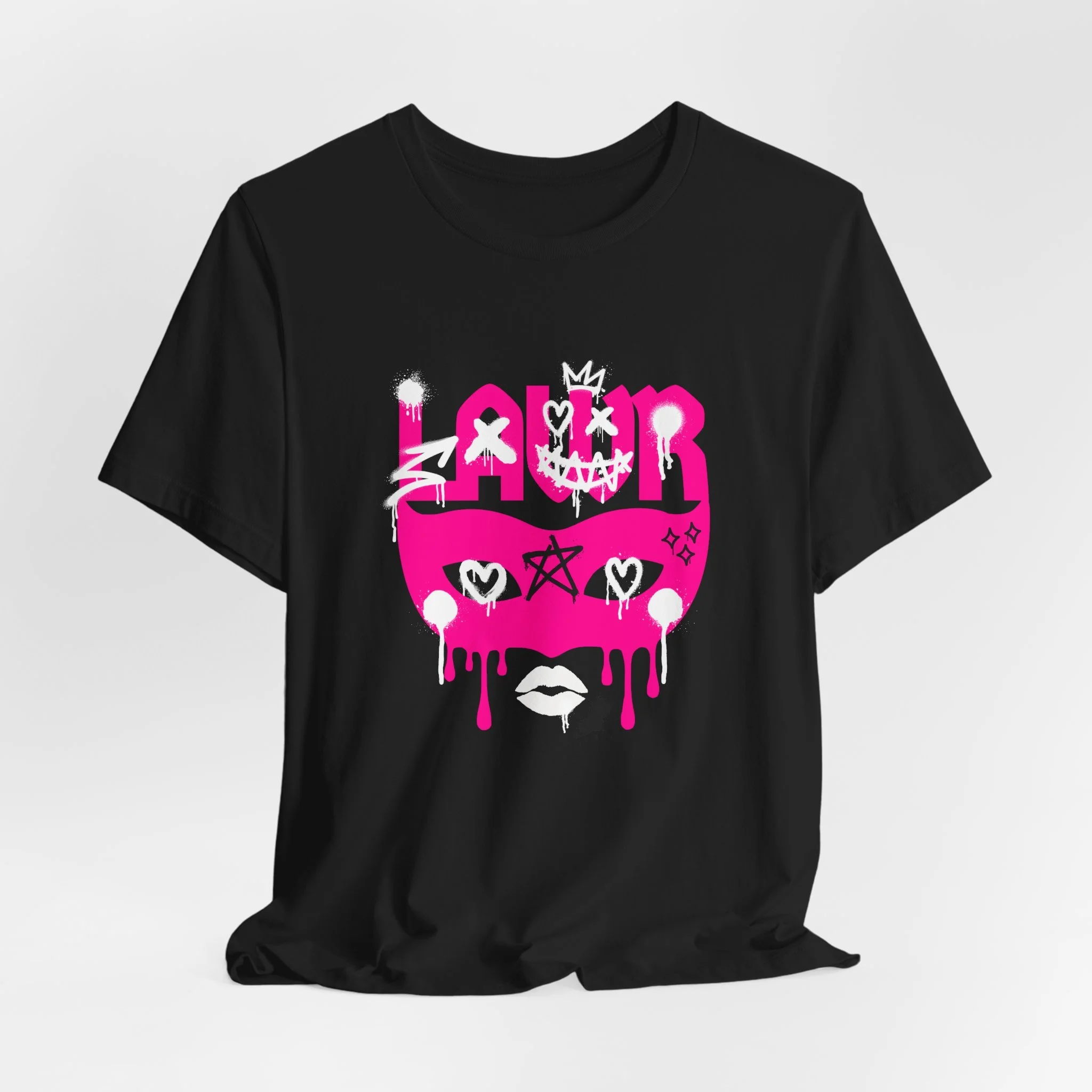 When I’m feeling cute but chaotic, I grab the LAWR mask logo with a full graffiti moment—spray paint marks, drips, hearts in the eyes, a little pentagram, the kissy mouth… all of it. It’s gothy-pink, a little punk, and definitely not here to be subtle.