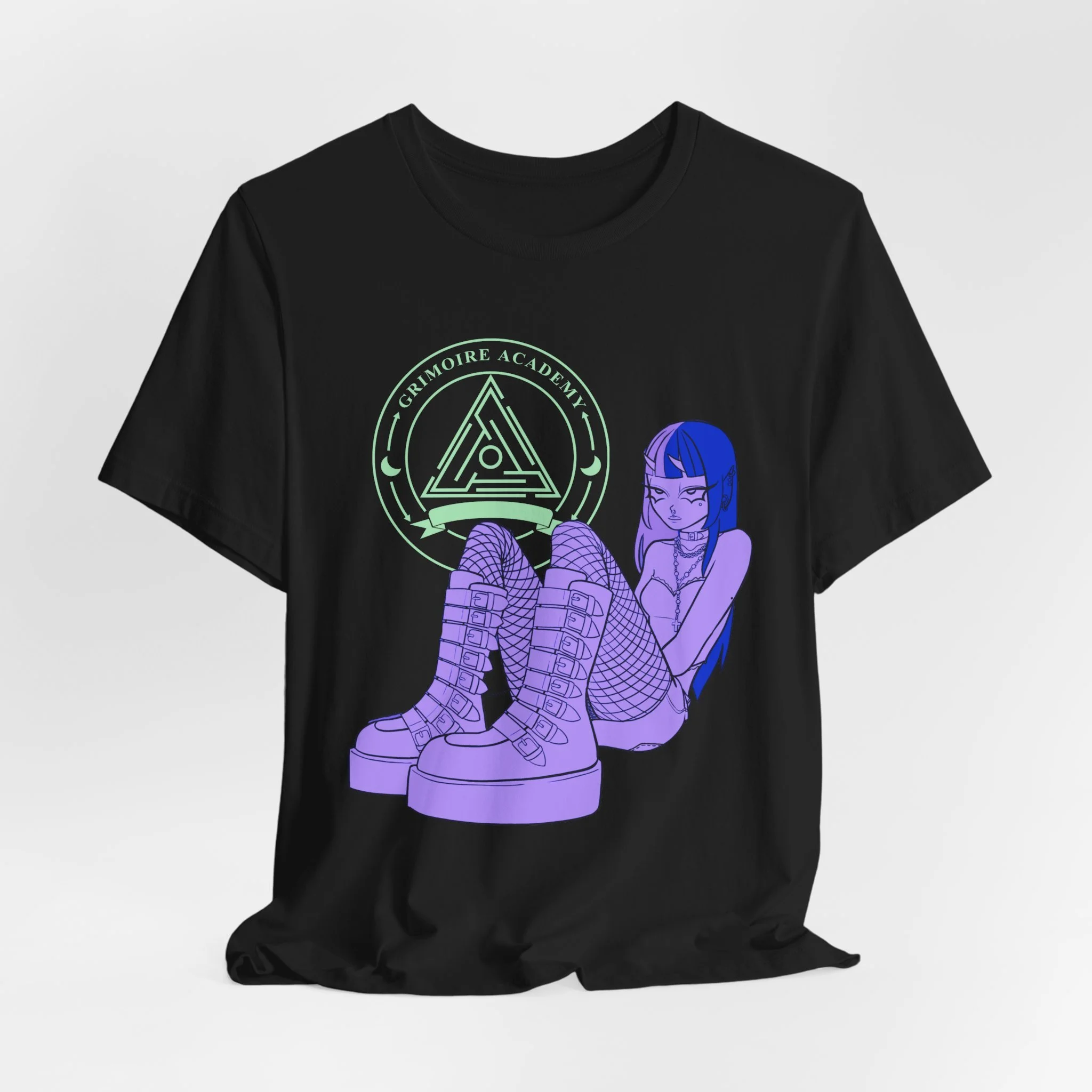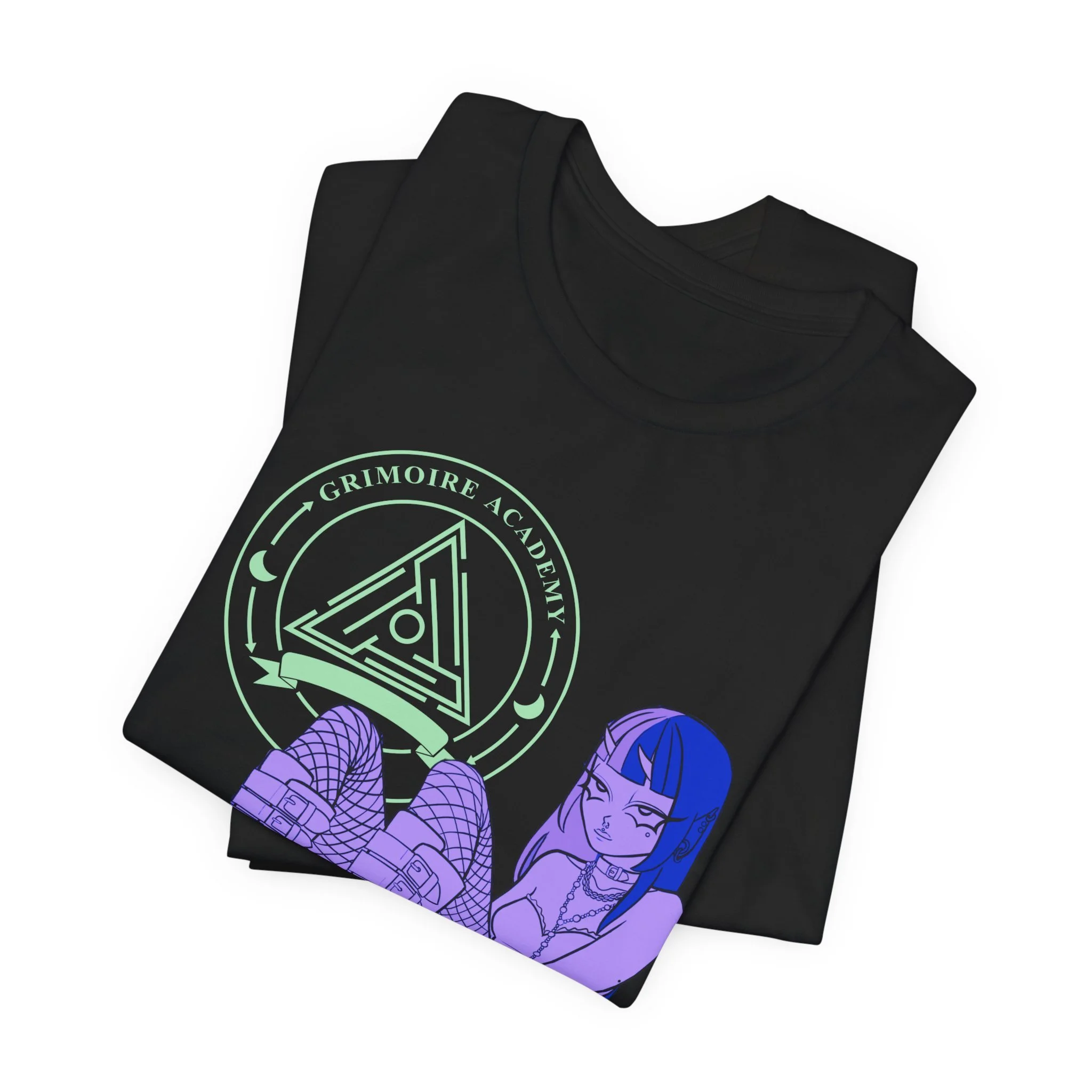 It features the Grimoire Academy seal in that neon mint glow, plus the illustrated girl from the event promos—fishnets, platforms, choker, and all—laid over the logo like a little mascot for the whole vibe. It’s cute, goth, and very “see you at the next market.”