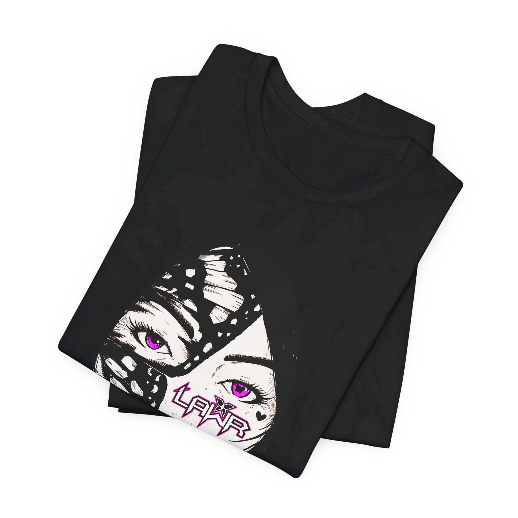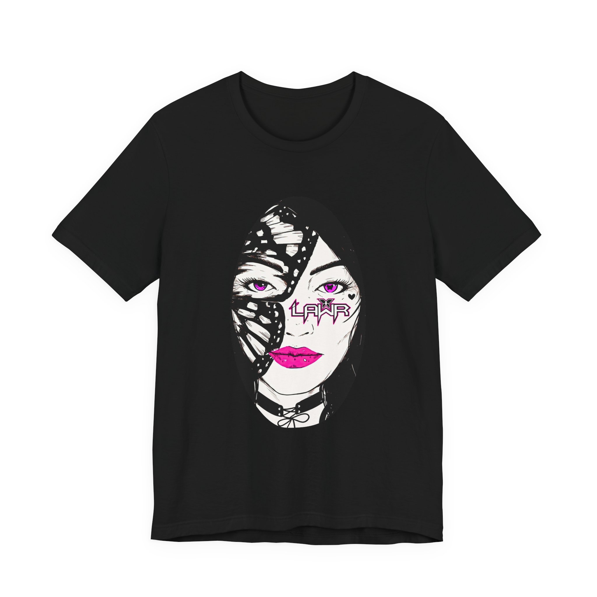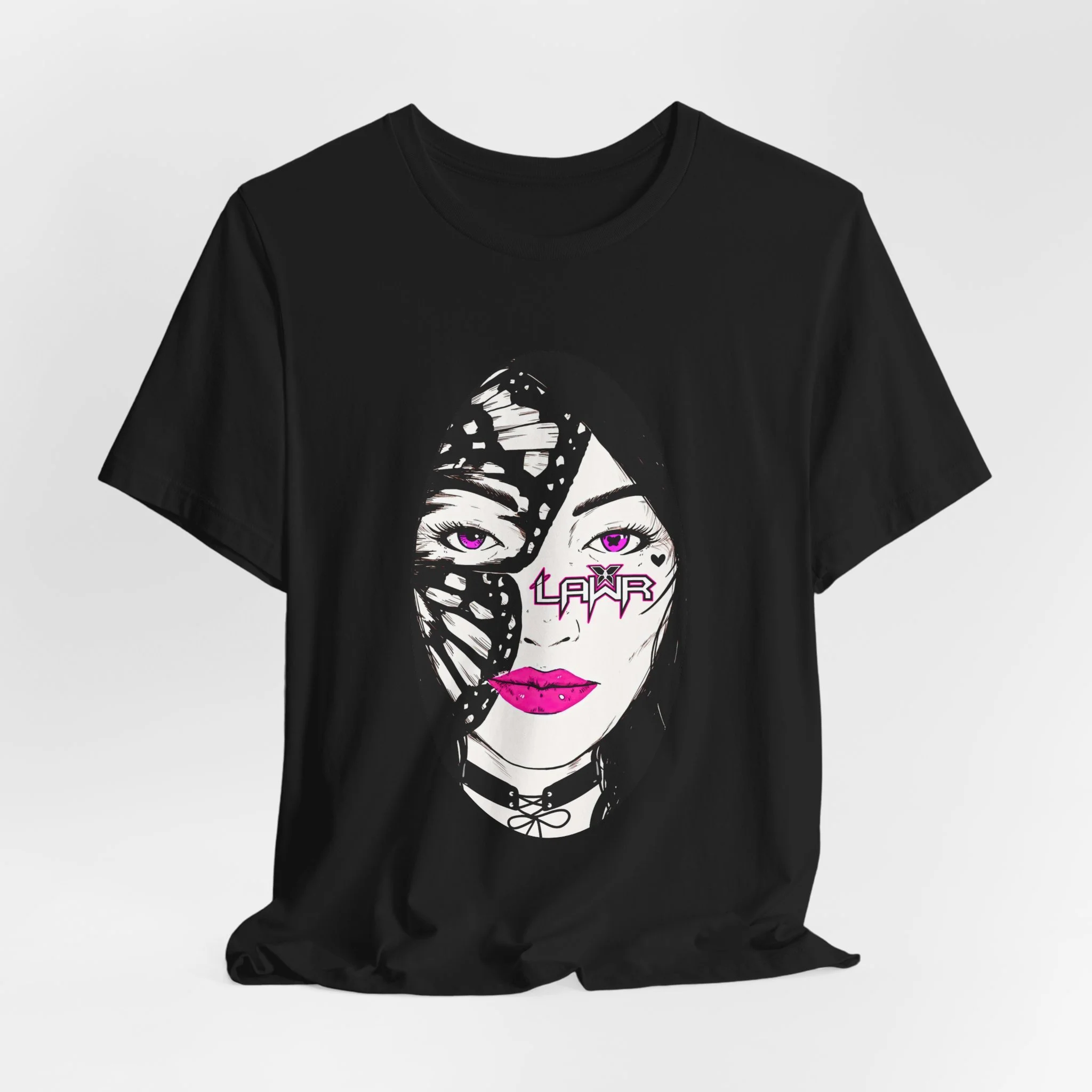 It’s the LAWR promo art with the pink eyes, the bright pink lips and that butterfly wing framing one side of the face.